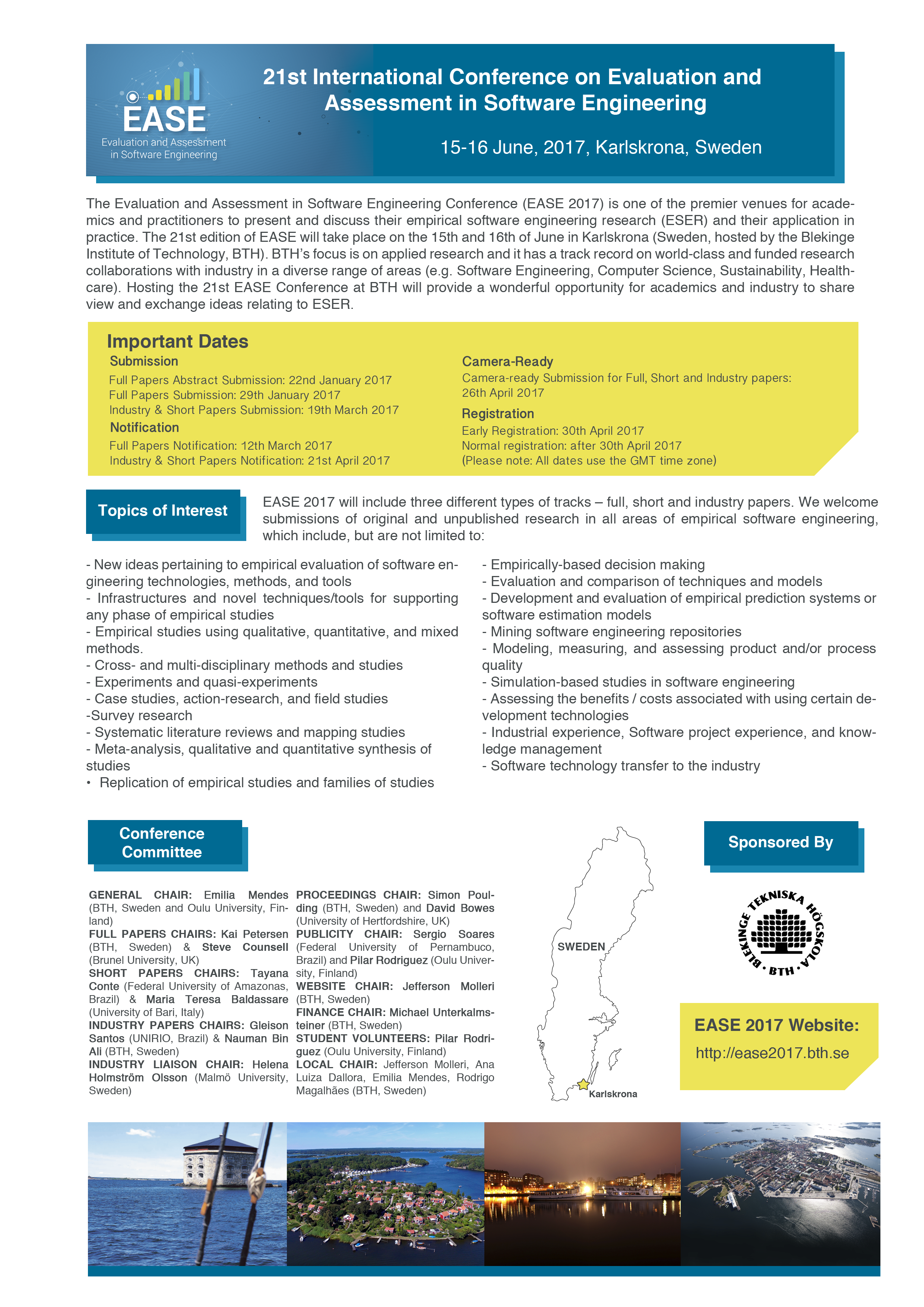 The 21st edition of EASE will take place from the 15th to the 16th of June at the Blekinge Institute of Technology (BTH), in the city of Karlskrona, in Sweden. BTH focuses on applied research with strong industrial collaboration; it offers about 35 educational programmes in 12 departments at two campuses located in Karslrkona and Karlshamn, to around 6,600 students (part-time and full-time).